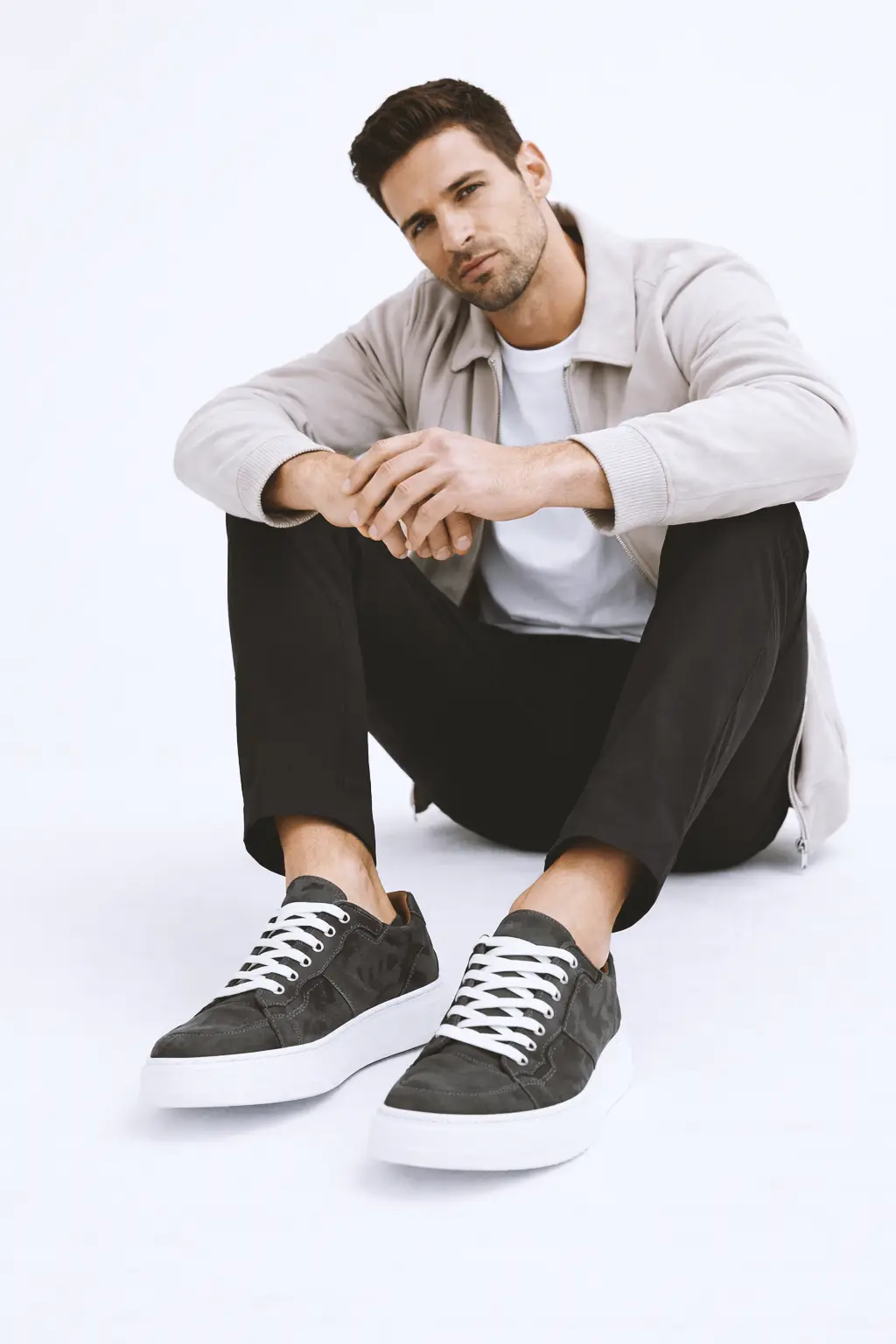 Muška patika u tamno sivoj nijansi od brušene kože sa platform đonom i blagim strukturiranim linijama. Uravnotežen spoj forme i prirodne teksture.
